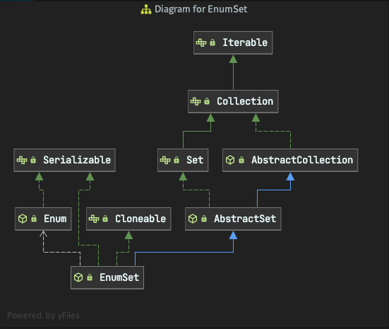 EnumSet은 추상 클래스이므로 직접 new를 사용한 인스턴스화가 불가능하지만 다양한 static 메소드를 제공하므로 그를 통해 사용할 수 있습니다.